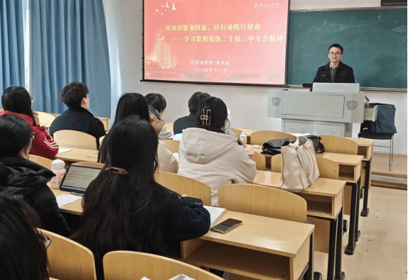 2024年12月5日上午,根据304永利集团“双带头人”宣讲方案的工作精神,304永利集团研究生公共外语部德语系支部书记章木林教授开展了题为《用知识服务国家,以行动践行使命——学习贯彻党的二十届三中全会精神》的专题宣讲。304永利集团40余名2025届毕业生参与学习。