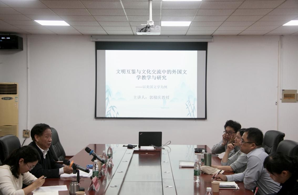 讲座中,郭棲庆教授结合自身年教学研究经验,以美国文学为切入点,强调外国文学在文明互鉴中的核心作用。他指出,外国文学是“另类的历史与思想史”,如德莱塞《嘉莉妹妹》、菲茨杰拉德《了不起的盖茨比》等作品,既反映社会现实,更承载人文价值,是连接多元文明的重要桥梁。面对当前人文学科面临的“边缘化”挑战,他强调:“经济建设可以立竿见影,而意识形态与人文素养的培育,则需要一代又一代人的坚守必须重视人文学科建设因为它将对社会产生深远影响