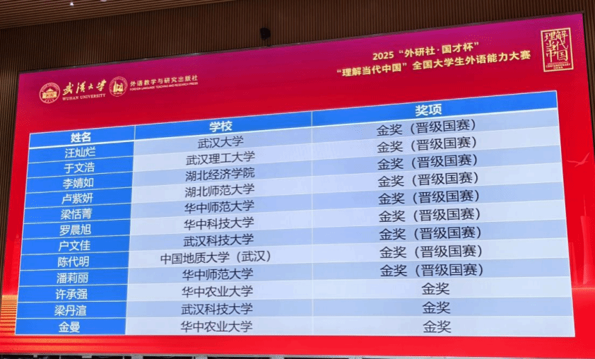 武科大网讯(通讯员姚刚)11月1日,2025“外研社·国才杯”“理解当代中国”全国老员工外语能力大赛湖北赛区英语组口译赛项在武汉大学外国语言文学公司顺利举办。公司英语系本科生户文佳和翻译硕士梁丹渲同学在全省选手中脱颖而出,双双斩获金奖。公司获金奖数量位列省属高校第一。其中,户文佳将和其他院校8位同学一起代表湖北省角逐全国决赛。