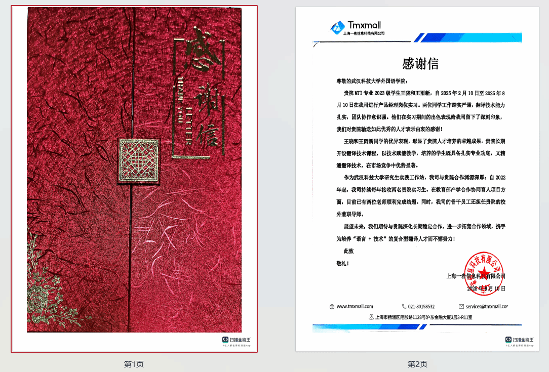 信中指出:“两位同学工作踏实严谨,翻译技术能力扎实,团队协作意识强。他们在实习期间的出色表现给我司留下了深刻印象,我们对贵院输送如此优秀的人才表示由衷的感谢!”