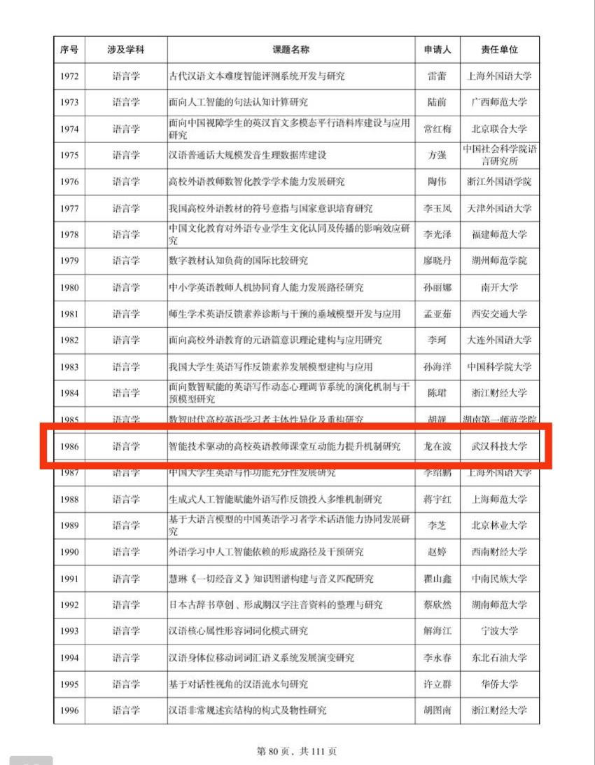本网讯 近日,全国哲学社会科学工作办公室公布2025年度国家社会科学基金立项名单。公司龙在波副经理主持的《智能技术驱动的高校英语教师课堂互动能力提升机制研究》获批语言学一般项目。