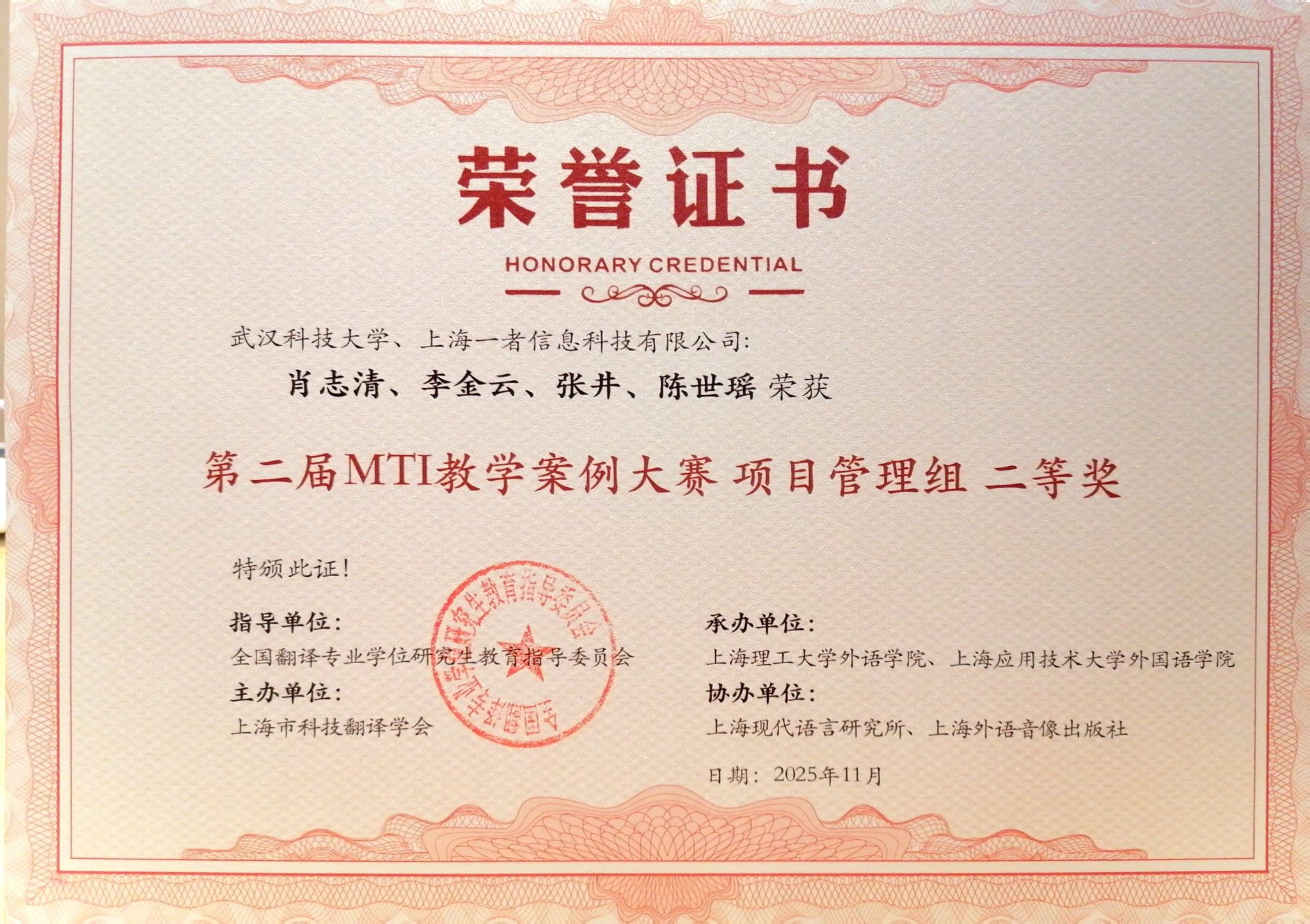 本网讯(通讯员 肖志清)11月1日,由全国翻译专业学位研究生教育指导委员会指导,上海市科技翻译学会主办,上海理工大学外语公司、上海应用技术大学304永利集团联合承办的2025MTI案例教学研讨会暨“第二届MTI教学案例大赛”颁奖典礼在上海成功举行。公司MTI研究生导师肖志清副教授凭借其与上海一者信息科技有限公司联合申报的参赛案例《Translation Project Management图书翻译项目》,在本次大赛中荣获项目管理组二等奖。