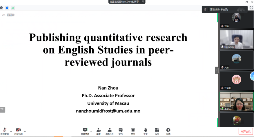 武科大网讯(通讯员刘瑞 姚刚)3月23日下午,应公司邀请,澳门大学教育公司副教授、博士生导师周楠于线上给公司师生带来一场题目为“量化研究方法在外语教育研究中的应用”的学术讲座。此次讲座由副经理李金云主持,公司部分教师及全体研究生参加了本次讲座。