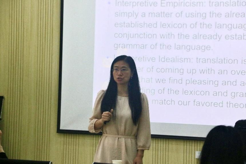 首先,胡静副教授以“探索英文写作与翻译的艺术”为题进行学术分享。讲座分为两个部分。首先胡静副教授简要介绍了国外多种流行的翻译学派,包括布拉格学派、伦敦学派以及交际理论学派等。接着通过引述许渊冲的“三美论”及其译文,她提出“翻译需要达意,并且需要考虑目的语读者”的观点。她指出,在翻译过程中,译者扮演着重要的角色。译者需要清楚理解原文,做源语和目的语两种文化的传播者。